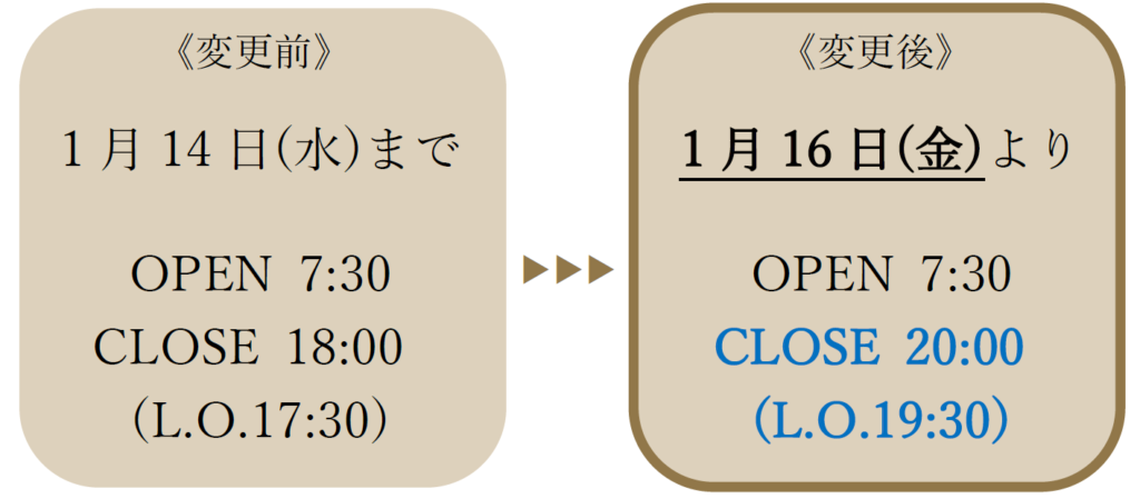 1月16日(金)より、当店の営業時間を下記の通り変更いたします。